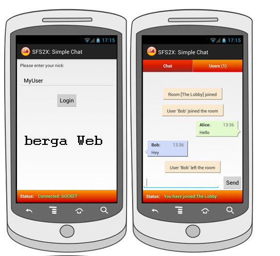 Setelah terhubung ke SmartFoxServer 2X pengguna diminta untuk memasukkan pegangan untuk sesi chat. Menggunakan pegangan ini, pengguna login ke dalam Zona BasicExamples tersedia di SFS2X secara default. Sebagai login pengguna, kita kemudian dapat beralih antara dua tampilan, salah satu yang menampilkan update status dan pesan chat publik, dan yang lainnya yang hanya berisi daftar semua pengguna login ke Ruang bergabung secara default.